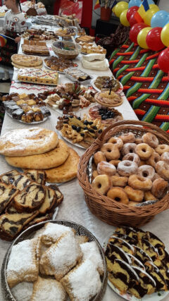 pregătite de părinți, bunici, cadre didactice și din care amintim: racii săraci (umpluți cu orez), pui pe sare, turtițe coapte, slănină, jumări, cârnați, saramură cu pește sau pui, urzici cu usturoi, fasole cu ciolan, sarmale, murături țărănești, mămăligă cu brânză, plăcinte cu dovleac, cu mere sau brânză, gogoși și cozonaci etc.